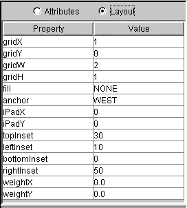 The Layout Panel contains the various GridBag constraints which control the placement and resizing behavior of an object. For more details on each of these constraints, refer to the GridBag Layout Manager document.
