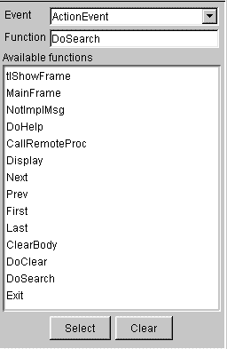 To associate an Event with a function, first select the event in the combobox, then click the desired function name in the Available functions listbox (scrolling if necessary), then click the "Select" button in the bottom set of buttons. This will add the specified function to the Function to execute field (below the Event name combobox).