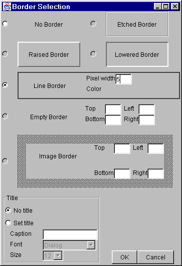 The Borders Editor window is used to add a visible border to a container object, typically a panel. To access this window, click in the "Border" property value field for a panel or other container which can have a border property, then click the button at the right of the value field to open the above window.
