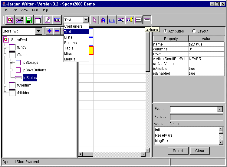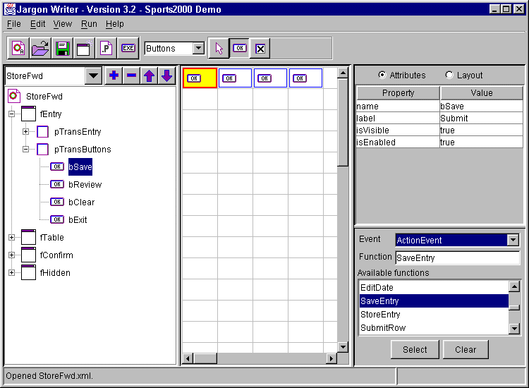 File-->NewEdit Contains menu choices for cut, copy and paste actions. Edit-->CutView Contains menu choices for viewing other windows and for changing Jargon Writer's "Look and Feel". View-->Script EditorRun Renders (paints) the currently active app, executes it in an emulator, or generates host source code for the remote procedure calls defined in the app's script. Run-->ExecuteHelp Displays various online documentation and other reference information. Help-->Help TopicsToolbars The toolbar panel contains two toolbars with buttons that perform different types of actions. The first toolbar contains six buttons that perform file-related actions, as discussed in "Working with XML Procedures" in Section 1. The second toolbar contains a set of component toolbars that are used to select component types when you are creating a screen layout in the Design Layout Panel.