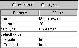 This panel on the right side of the Design Window contains three panels: an Attributes Panel, a Layout Panel, and an Events Panel. The Events Panel is always displayed at the bottom, while the other two panels can be viewed by selecting either the Attributes or Layout radio buttons at the top of this Properties Panel.