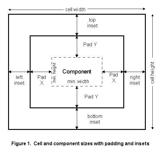 The GridX, GridY, GridW and GridH values are read-only. These values are determined by the placement of an object in the Design Layout Panel (its X/Y coordinates) and by how many cells it occupies (its height/width).The following diagram (Figure 1) may help to explain the various GridBag constraint parameters.
