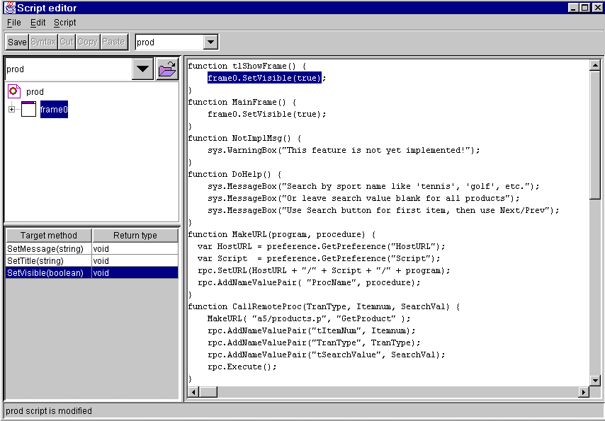 The methods available for use in client functions are shown in alphabetical order in a listbox at the lower left of the Script Editor Window, for the component which is highlighted in the target tree above it. Classes are listed in alphabetical order.